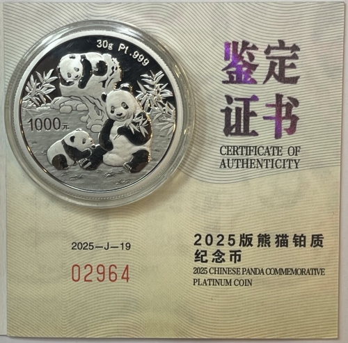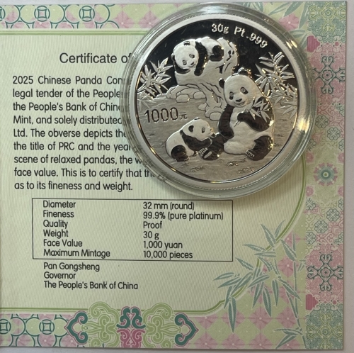 1000 юаней Панда 2025 год, платина, Pt 999, 30г.