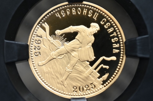 Червонец Сеятель 2025г.,Золото, "К 100-летию чеканки пробного Червонца 1925г." в слабе ННР PROOF