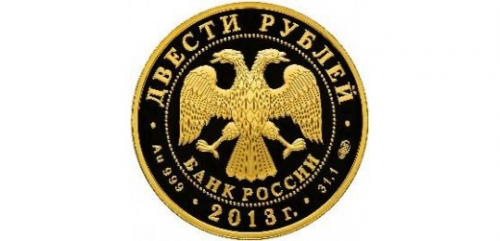 Вверху вдоль канта номинал «ДВЕСТИ РУБЛЕЙ», внизу слева химическое название «Au» и проба «999» металла, внизу по центру год выпуска «2013 г.», внизу справа чистый вес находящегося в монете драгоценного металла «31,10» и монограмма монетного двора «ММД». В середине в ободке из точек двуглавый орел под ним с внутренней стороны точечного ободка слова «БАНК РОССИИ».