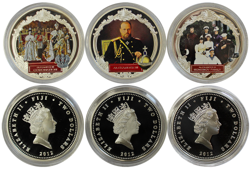 Набор из 3 серебряных монет "Александр 3" 2 доллара, 2012 год, 31,1 грамм каждая, Фиджи