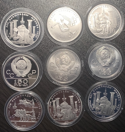 • В рамках подготовки к XXII летним Олимпийским играм 1980 года в Москве, впервые в СССР были выпущены монеты из платины. В 1977-1980 было отчеканено 5 памятных монет на олимпийскую тематику (аверс — герб СССР и номинал монеты 150 рублей, реверс — фрагменты Античных Олимпийских игр) тиражами от 12 до 24 тысяч шт. каждая, в двух вариантах — proof и uncirculated.