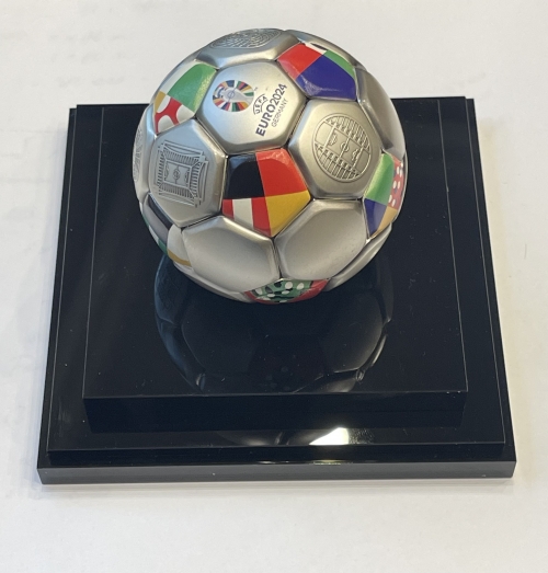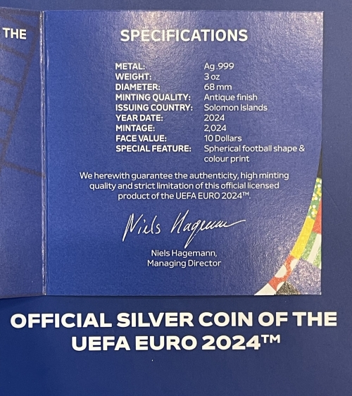 Серебряная монета 10 долларов в виде футбольного мяча посвященная Чемпионату Европы 2024г. в Германии, Соломоновы Острова, 93,3г., 3OZ, ТИРАЖ 2024 шт, Ag 999