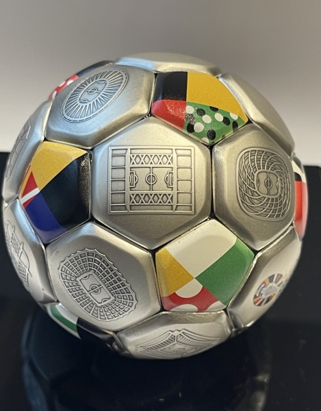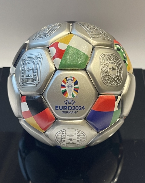На шарообразной монете размещены цветные изображения флагов участвующих в Евро 2024 стран, официальный логотип футбольного состязания, схематические изображения стадионов, где пройдут основные мероприятия турнира.