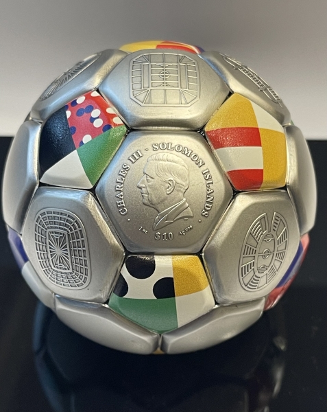 В апреле от имени Соломоновых остров вышли монеты шарообразной формы, похожие на футбольный мяч. 10 долларов выпускаются к грядущему Чемпионату Европы по футболу, который пройдет в Германии.