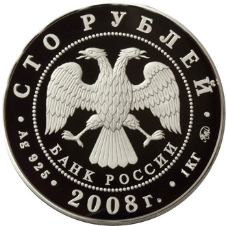 в центре диска - эмблема Банка России (двуглавый орел с опущенными крыльями, под ним - надпись полукругом "БАНК РОССИИ"), обрамленная кругом из точек и надписями по кругу: вверху - "СТО РУБЛЕЙ", внизу: слева - обозначения драгоценного металла и пробы сплава, в центре - дата выпуска "2008 г.", справа - содержание химически чистого металла и товарный знак монетного двора.