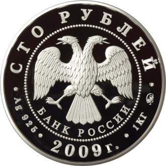 в центре диска - эмблема Банка России (двуглавый орел с опущенными крыльями, под ним - надпись полукругом "БАНК РОССИИ"), обрамленная кругом из точек и надписями по кругу: вверху - "СТО РУБЛЕЙ", внизу: слева - обозначения драгоценного металла и пробы сплава, в центре - дата выпуска "2009 г.", справа - содержание химически чистого металла и товарный знак монетного двора.