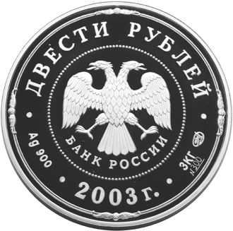 в центре - эмблема Банка России (двуглавый орел с опущенными крыльями, под ним - надпись полукругом "БАНК РОССИИ"), обрамленная кругом из точек и надписями, вверху - номинал: "ДВЕСТИ РУБЛЕЙ", внизу: слева - обозначения драгоценного металла и пробы сплава, в центре - год выпуска "2003 г.", справа в две строки - содержание химически чистого металла, товарный знак монетного двора и порядковый номер монеты №__, вдоль канта – две концентрические линии с четырьмя декоративными элементами.
