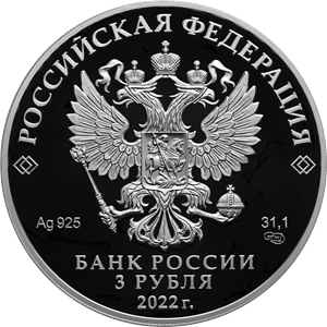 рельефное изображение Государственного герба Российской Федерации, над ним вдоль канта – надпись полукругом: «РОССИЙСКАЯ ФЕДЕРАЦИЯ», обрамленная с обеих сторон сдвоенными ромбами, под гербом: слева – обозначения драгоценного металла и пробы сплава, справа – содержание химически чистого металла и товарный знак монетного двора, внизу в центре в три строки – надпись: «БАНК РОССИИ», номинал монеты: «3 РУБЛЯ», год выпуска: «2022 г.».