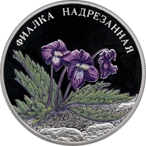 изображение фиалки надрезанной, цветки которой выполнены в рельефе с нанесением цветной печати, листья и черешки – в технологии цветной печати по плоской поверхности, изображение камней, выполненное в рельефе, и изображение земли, выполненное в технологии лазерного матирования; вверху вдоль канта – рельефная надпись: «ФИАЛКА НАДРЕЗАННАЯ».