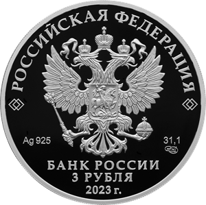 рельефное изображение Государственного герба Российской Федерации, над ним вдоль канта – надпись полукругом «РОССИЙСКАЯ ФЕДЕРАЦИЯ», обрамленная с обеих сторон сдвоенными ромбами, под гербом: слева – обозначения драгоценного металла и пробы сплава, справа – содержание химически чистого металла и товарный знак монетного двора, внизу в центре в три строки – надпись «БАНК РОССИИ», номинал монеты «3 РУБЛЯ», год выпуска «2023 г.».