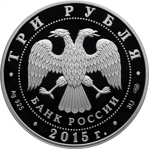 в центре – эмблема Банка России (двуглавый орёл с опущенными крыльями, под ним – надпись полукругом "БАНК РОССИИ"), обрамленная кругом из точек и надписями по кругу – вверху: "ТРИ РУБЛЯ", внизу: слева – обозначения драгоценного металла и пробы сплава, в центре – год выпуска "2015 г.", справа – содержание химически чистого металла и товарный знак монетного двора.