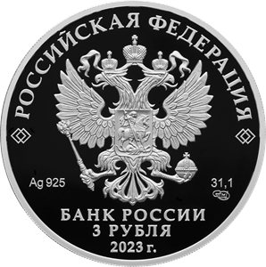 рельефное изображение Государственного герба Российской Федерации, над ним вдоль канта – надпись полукругом: «РОССИЙСКАЯ ФЕДЕРАЦИЯ», обрамленная с обеих сторон сдвоенными ромбами, под гербом: слева – обозначения драгоценного металла и пробы сплава, справа – содержание химически чистого металла и товарный знак монетного двора, внизу в центре в три строки – надпись: «БАНК РОССИИ», номинал монеты: «3 РУБЛЯ», год выпуска: «2023 г.».