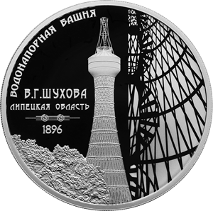 Серебряная монета 3 рубля "Водонапорная башня (Шуховская), Липецкая область" 31,1г., Ag 925 , Proof, 2023г.