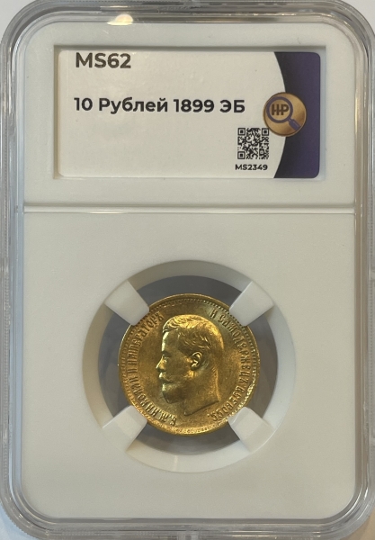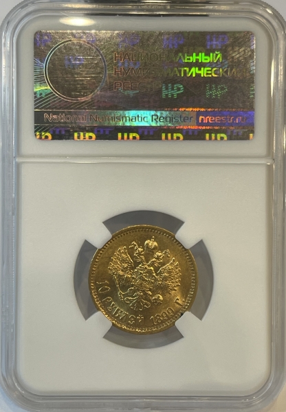 Золотая монета 10 рублей Николай II 1899г.,ЭБ, в слабе ННР MS 62