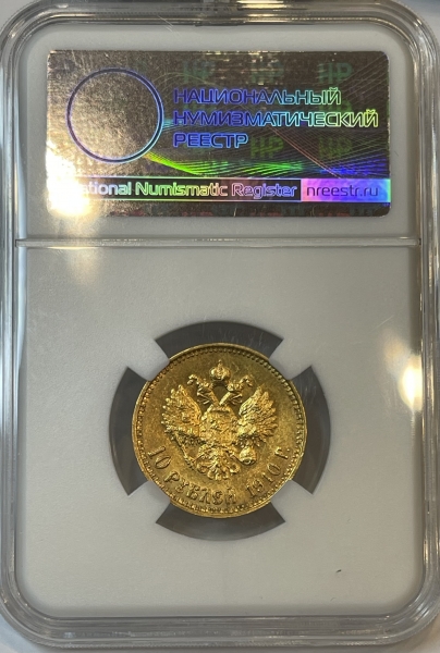 Золотая монета 10 рублей Николай II 1910г., в слабе ННР MS 60