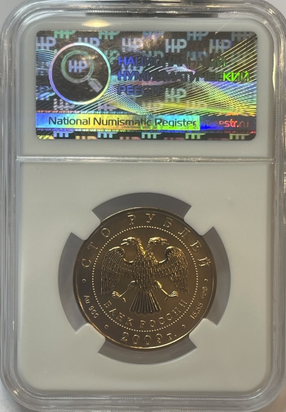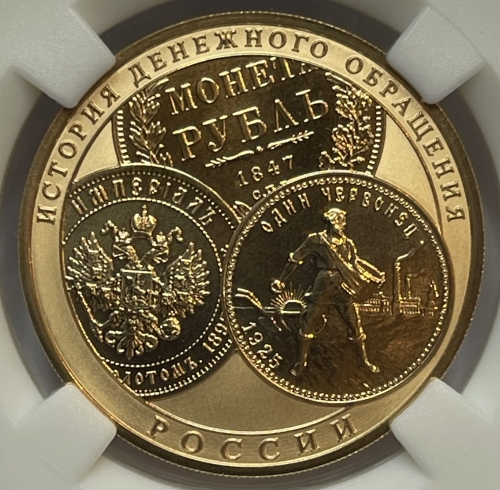 Золотая монета 100 рублей История Денежного Обращения в слабе ННР MS 70 , СПМД , 2009 г., 15,55 г.