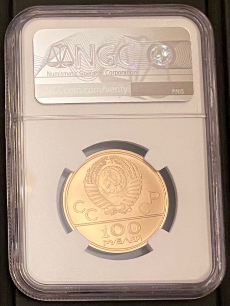 Золотая монета 100 рублей "Спортивный зал Дружба" Олимпиада 80, 1979г., в слабе NGC MS 69