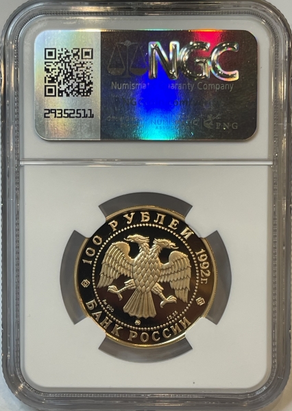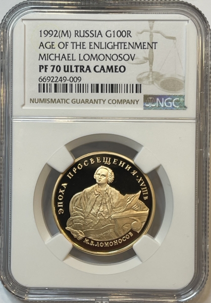 Золотая монета 100 рублей "М.В. Ломоносов" Эпоха просвещения XVIII в., 1992г., 15,55г., Au 900, ММД,В СЛАБЕ NGC PROOF 70 ULTRA CAMEO