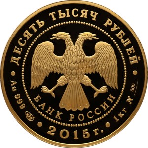 в центре диска – эмблема Банка России (двуглавый орел с опущенными крыльями, под ним – надпись полукругом "БАНК РОССИИ"), обрамленная кругом из точек и надписями по кругу – вверху: "ДЕСЯТЬ ТЫСЯЧ РУБЛЕЙ", внизу: слева – обозначения драгоценного металла, пробы сплава и товарный знак монетного двора, в центре – дата выпуска "2015 г.", справа – содержание химически чистого металла и порядковый номер монеты № s__.