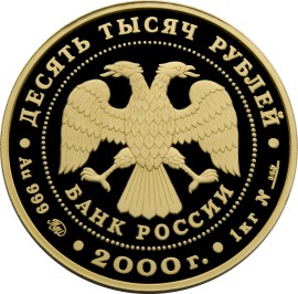 в центре - эмблема Банка России (двуглавый орел с опущенными крыльями, под ним - надпись полукругом "БАНК РОССИИ"), обрамленная кругом из точек и надписями, вверху - номинал: "ДЕСЯТЬ ТЫСЯЧ РУБЛЕЙ", внизу: слева - обозначения драгоценного металла, пробы сплава и товарный знак монетного двора, в центре - год выпуска "2000 г.", справа – содержание химически чистого металла и порядковый номер монеты №___.
