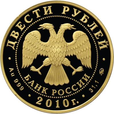 • Аверс: в центре - эмблема Банка России (двуглавый орёл с опущенными крыльями, под ним - надпись полукругом "БАНК РОССИИ"), обрамленная кругом из точек и надписями по кругу - вверху: "ДВЕСТИ РУБЛЕЙ", внизу: слева - обозначения драгоценного металла и пробы сплава, в центре - дата выпуска "2010 г.", справа - содержание химически чистого металла и товарный знак монетного двора.