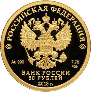 на зеркальном поле диска – рельефное изображение Государственного герба Российской Федерации, над ним вдоль канта – надпись полукругом: "РОССИЙСКАЯ ФЕДЕРАЦИЯ", обрамленная с обеих сторон сдвоенными ромбами, внизу под гербом: слева – обозначения драгоценного металла и пробы, справа – содержание химически чистого металла и товарный знак монетного двора, внизу в центре – надпись в три строки: "БАНК РОССИИ", номинал монеты: "50 РУБЛЕЙ", год выпуска: "2018 г.".