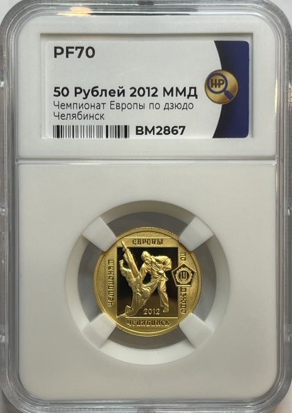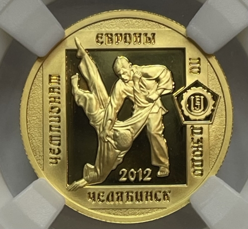 При разработке художественного оформления реверса золотой монеты номиналом 50 рублей в качестве основного изображения была выбрана скульптура заслуженного скульптора России Виктора Митрошина, установленная перед Центром олимпийской подготовки по дзюдо в г. Челябинске.