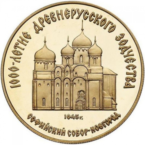 Золотая монета 50 рублей "Софийский собор, Великий Новгород XI век" 1000-летие Древнерусского Зодчества 1988г.,7,78г., ММД , Au 900