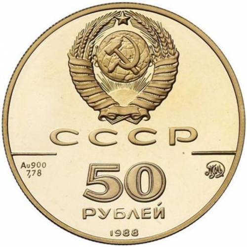 Сверху герб СССР с 15 витками ленты, под ним буквы «СССР», ниже слева и справа черта, под чертой слева химическое обозначение «Au» и проба «900» металла из которого сделана монета, под ними чистый вес драгоценного металла «7,78», под чертой справа монограмма монетного двора «ММД», ниже обозначение достоинства монеты цифра «50» и ниже слово «РУБЛЕЙ», внизу у канта год выпуска монеты «1988».
