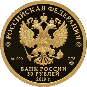 Рельефное изображение Государственного герба Российской Федерации, над ним вдоль канта – надпись полукругом: "РОССИЙСКАЯ ФЕДЕРАЦИЯ", обрамленная с обеих сторон сдвоенными ромбами, внизу под гербом: слева – обозначения драгоценного металла и пробы, справа – содержание химически чистого металла и товарный знак монетного двора, внизу в центре в три строки – надпись: "БАНК РОССИИ", номинал монеты: "50 РУБЛЕЙ", год выпуска: "2019 г.".