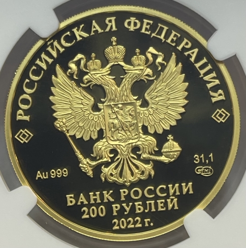 на зеркальном поле диска — рельефное изображение Государственного герба Российской Федерации, над ним вдоль канта — надпись полукругом: «РОССИЙСКАЯ ФЕДЕРАЦИЯ», обрамленная с обеих сторон сдвоенными ромбами, внизу под гербом: слева — обозначения драгоценного металла и пробы сплава, справа — содержание химически чистого металла и товарный знак монетного двора, внизу в центре в три строки — надпись: «БАНК РОССИИ», номинал монеты: «200 РУБЛЕЙ», год: «2022 г.».