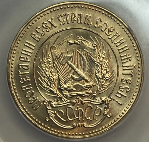 Герб РСФСР, окруженный венком из колосьев, и щит с изображением на нем серпа и молота на фоне солнечных лучей; по краю монеты точки вдоль них надписи: сверху - «ПРОЛЕТАРИИ ВСЕХ СТРАН, СОЕДИНЯЙТЕСЬ!», внизу под гербом - «Р. С. Ф. С. Р.».