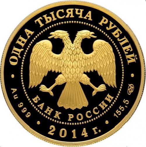 в центре – эмблема Банка России (двуглавый орёл с опущенными крыльями, под ним – надпись полукругом "БАНК РОССИИ"), обрамленная кругом из точек и надписями по кругу – вверху: "ОДНА ТЫСЯЧА РУБЛЕЙ", внизу: слева – обозначения драгоценного металла и пробы сплава, в центре – дата выпуска "2014 г.", справа – содержание химически чистого металла и товарный знак монетного двора.