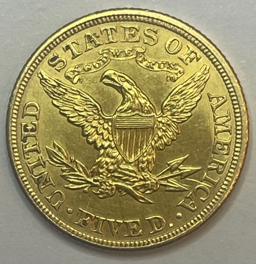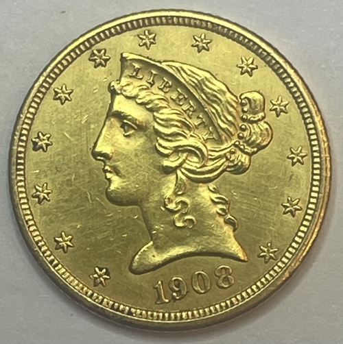 Золотая монета "Голова Свободы" 5 долларов США 1908г.