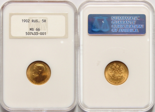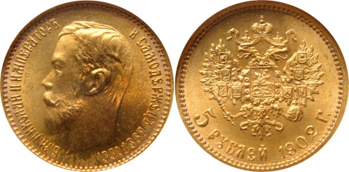 Золотая монета Николая II 5 рублей 1902 год состояние MS 66