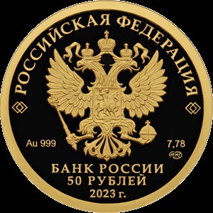 рельефное изображение Государственного герба Российской Федерации, над ним вдоль канта – надпись полукругом: «РОССИЙСКАЯ ФЕДЕРАЦИЯ», обрамленная с обеих сторон сдвоенными ромбами, под гербом: слева – обозначения драгоценного металла и пробы, справа – содержание химически чистого металла и товарный знак монетного двора, внизу в центре в три строки – надпись: «БАНК РОССИИ», номинал монеты: «50 РУБЛЕЙ», год выпуска: «2023 г.».