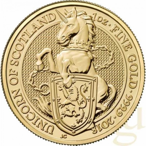 Реверс: показан коронованный единорог, разрывающий цепь и опирающийся на щит. Вдоль края монеты полукругом выгравированы надписи, разделенные точками: вверху – «2018», внизу - «UNICORN OF SCOTLAND» («Шотландский единорог»). Слева обозначены инициалы дизайнера – «JC» ( Джоди Кларк - Jody Clark).