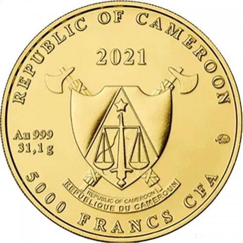 На аверсе золотой монеты Князь Юрий Долгорукий в центре диска располагается рельефный Государственный Герб Республики Камерун.